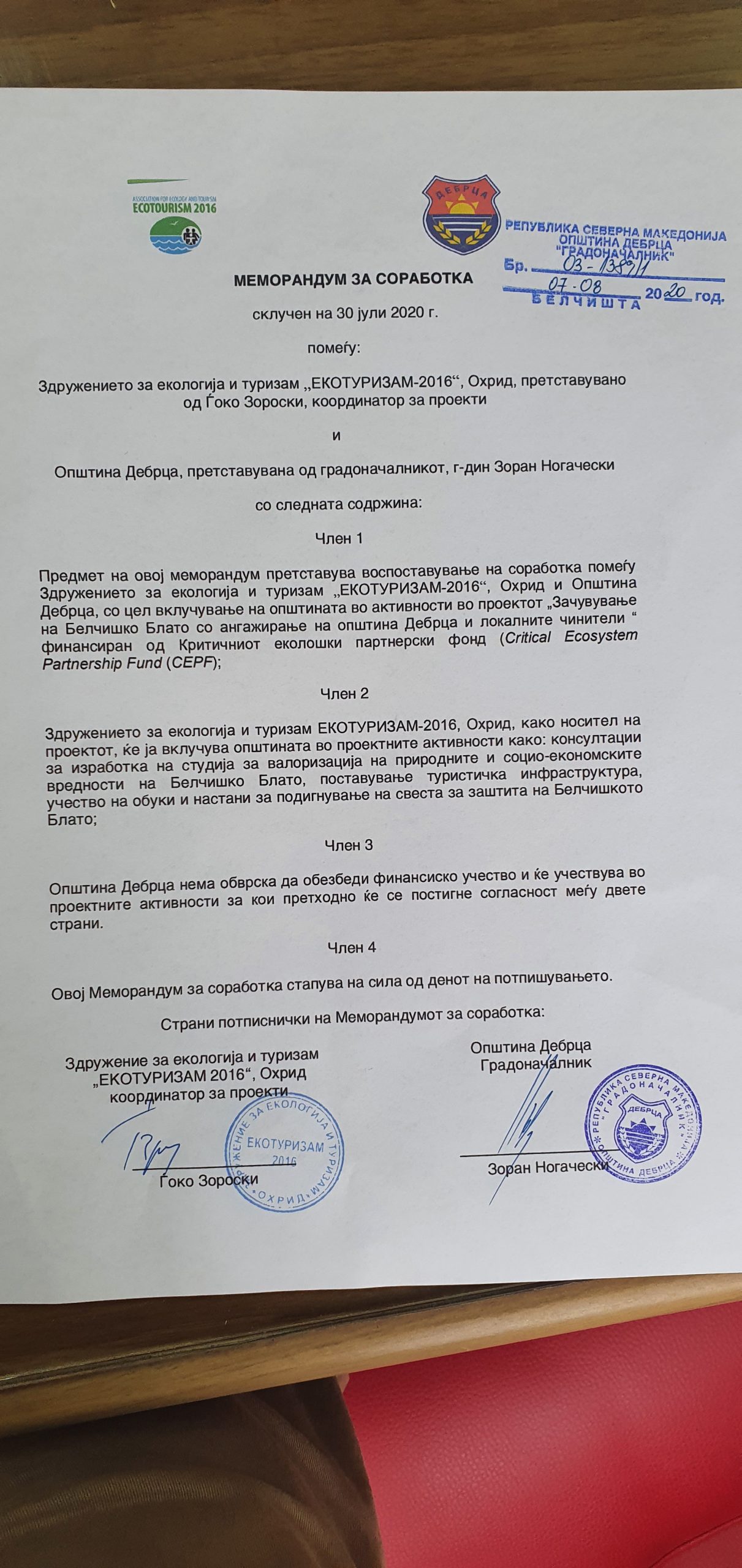 Денес проектниот координатор Ѓоко Зороски и градоначалникот Зоран Ногачески го потпишааа Меморандумот за соработка на проектот: “ Зачувување на Белчишко Блато со ангажирање на општина Дебрца и локални чинители”, финансиран од Критичниот еколошки партнерски фонд ( Critical Ekosystem Partnership Fund-CEPF ).