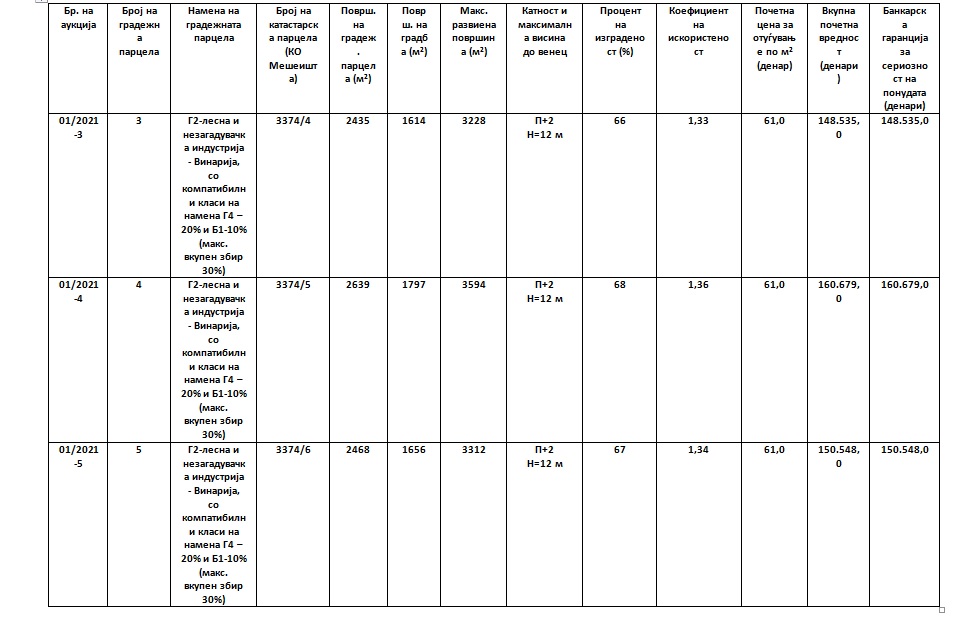 Согласно Програмата за располагање со градежно земјиште во сопственост на Република Северна Македонија за 2020 година  бр. 01-1495/12 од 31.08.2020 година објавена во Службен гласник на Општина Дебрца бр.09/2020 од 04.09.2020 година, предмет на електронското јавно наддавање е отуѓување на градежно земјиште, сопственост на Република Северна Македонија, предвидено со (УПМНВ) Урбанистички план за вон населено место – Мешеишта, за изградба на Винарии, на дел од КП-3374, м.в. Подлабинци, КО- Мешеишта, Општина Дебрца, усвоен со Одлука бр. 07- 900/5 од  29.12.2010 год., со намена за изградба на Г2–лесна и незагадувачка индустрија – винарии, /со можност за  компатибилни  класи  на  намени  во  однос  на основната намена со мах.  до 30 %,  и тоа  Г4 – стоваришта- 20 % и Б1 – мали комерцијални и деловни намени – 10 % /, согласно табеларниот преглед, во кој се дадени податоците за градежната парцела, намената на градежната парцела, вкупната површина на градежната парцела, катност, површина за градење, максимална висина до венец, процент на изграденост, коефициент на искористеност, почетна цена по м² за отуѓување, вкупна почетна цена за отуѓување и банкарска гаранција за сериозност на понудата.