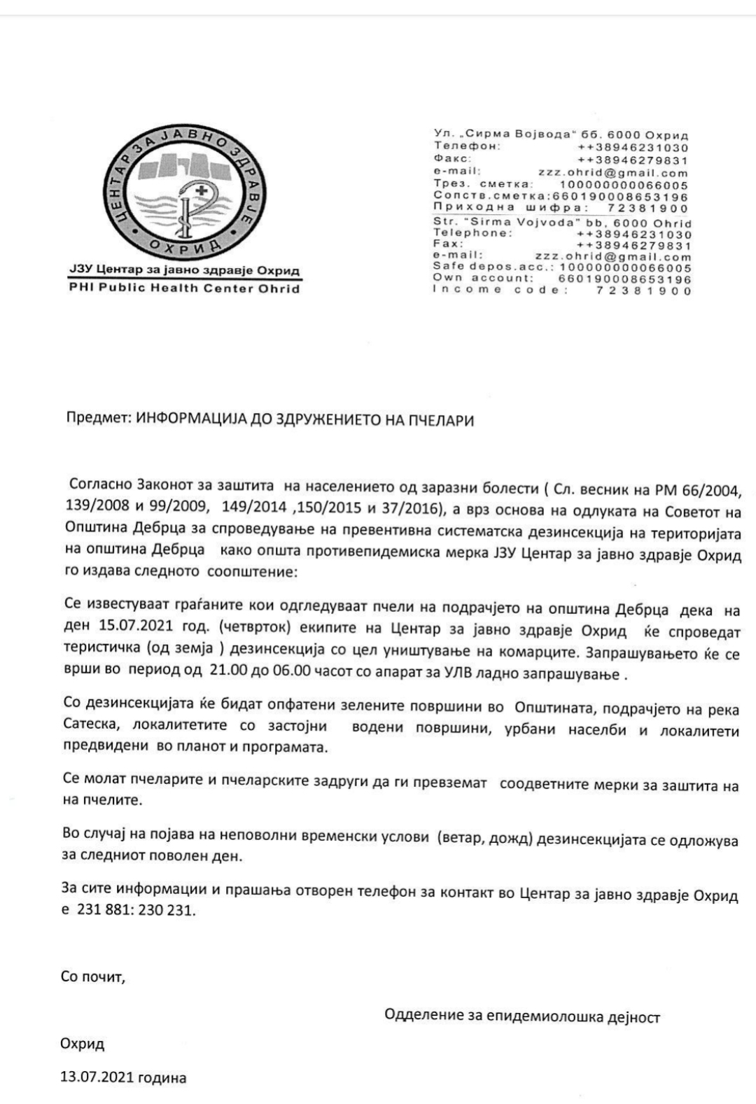 Информација до Здружението на пчелари